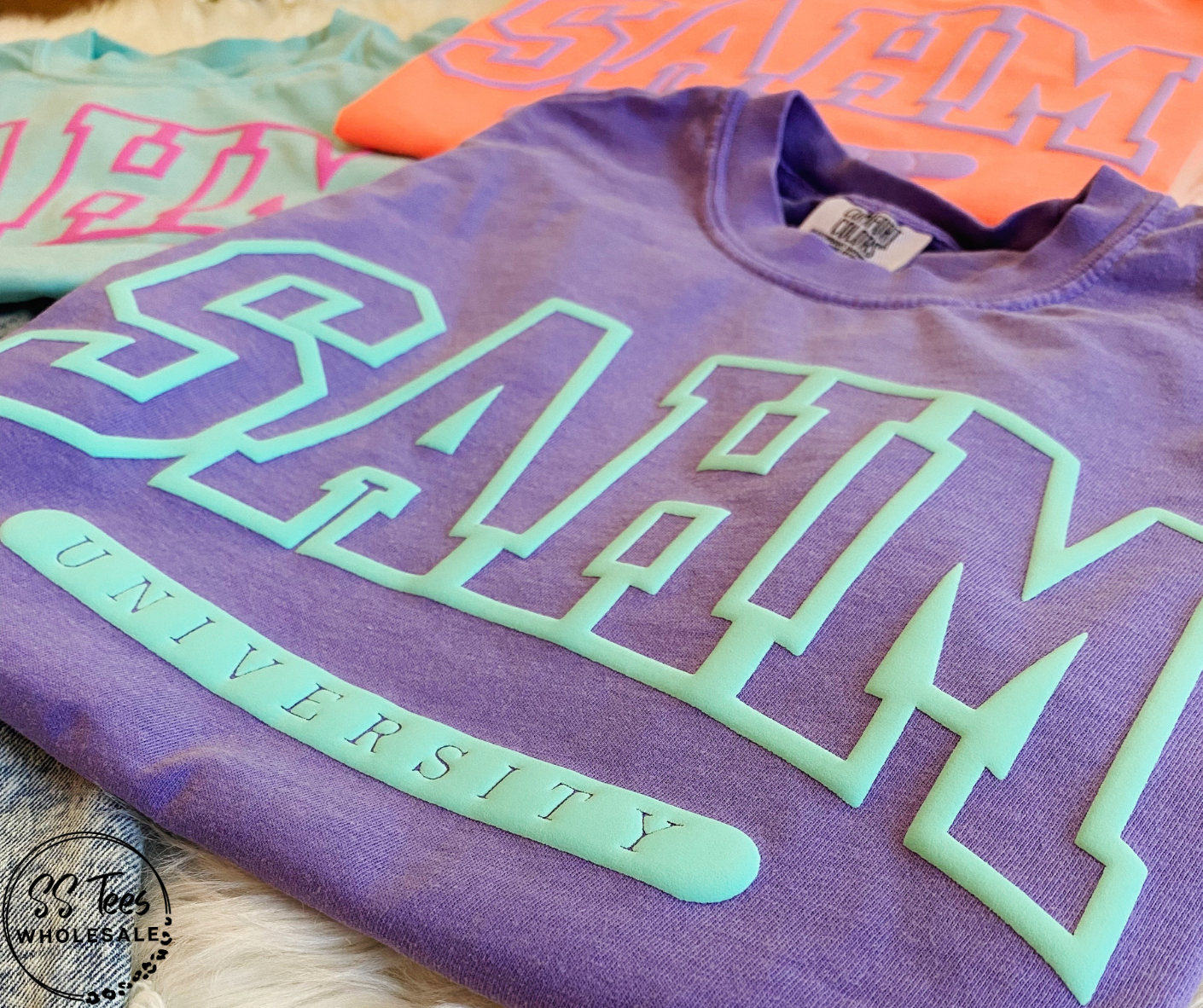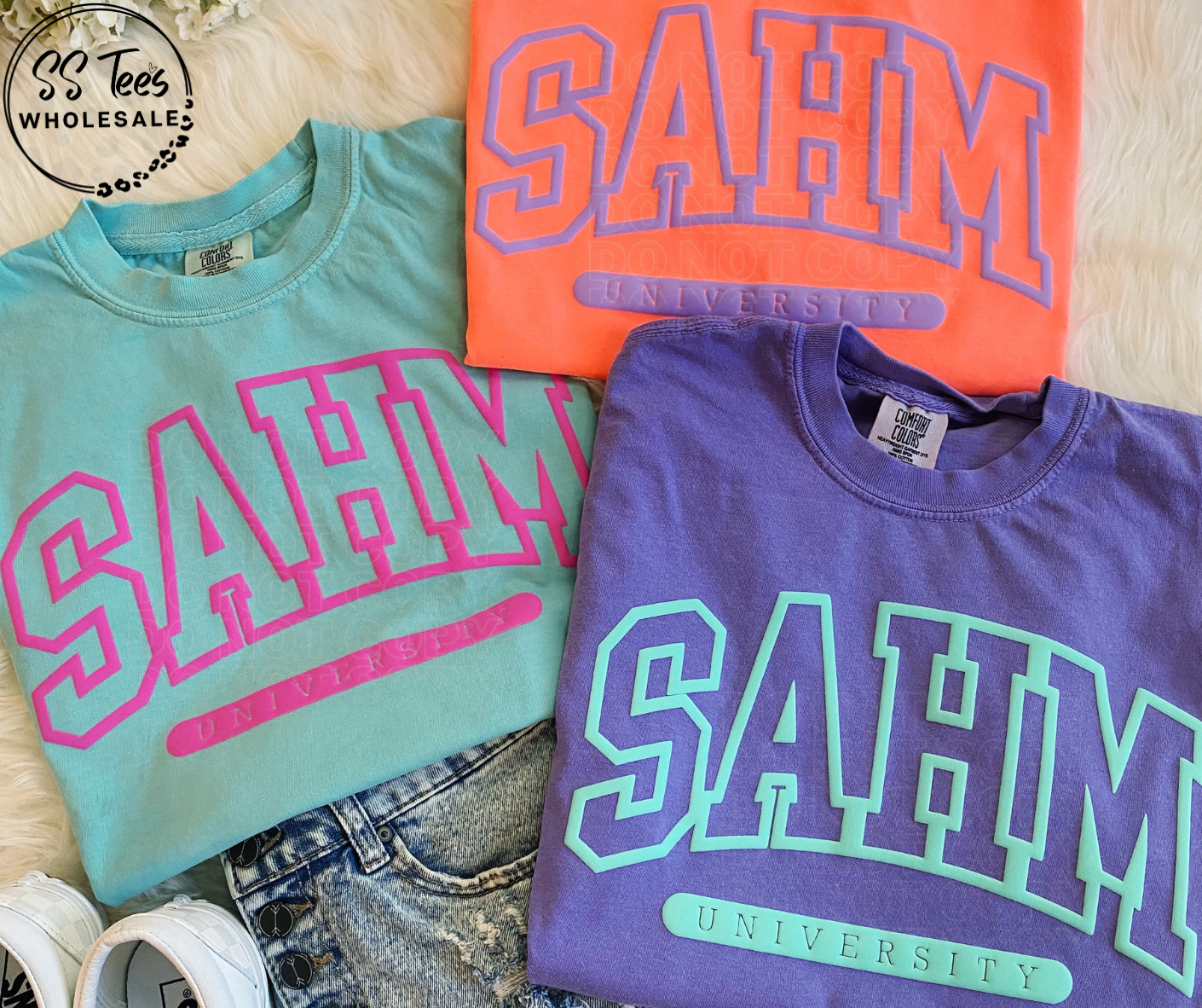This PUFF ink is everything! SAHM (Stay At Home Mom) University printed on your choice of beautiful Comfort Colors pigment dyed tees.
